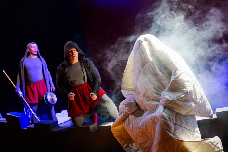 Петербургский режиссёр Наташа Слащёва и художник Виктор Клочко уже создавали в НОТЕКе спектакли с причудливо-парадоксальной простотой визуального языка — у всех на памяти тарно-мебельный, дощатый мир спектакля «Про Ёжика и Медвежонка» и почти лавкрафтовская кляксография спектакля «Муму». В общем, язык Слащёвой — это мир кукол, которые как бы и не совсем куклы в обычном понимании.